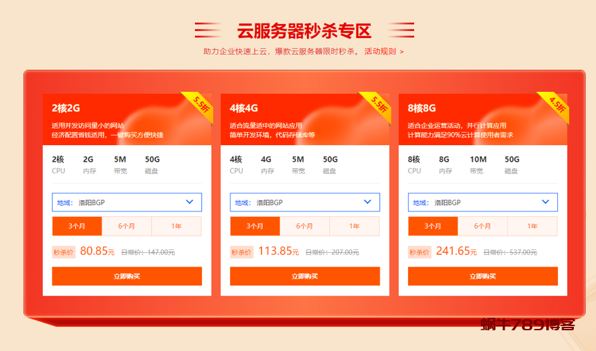 | 4核8G | BGP8M独享 | 80G高效云硬盘 | 河南洛阳BGP线路超低延迟 | 89/月 | 258/季 | 890/年 | |