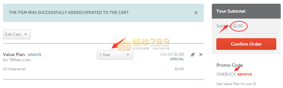 提示:如果购买过程当中选择了.website免费域名,使用优惠码后需要支付2美元/年。如果选择绑定自己现有域名,则只需1美元/年