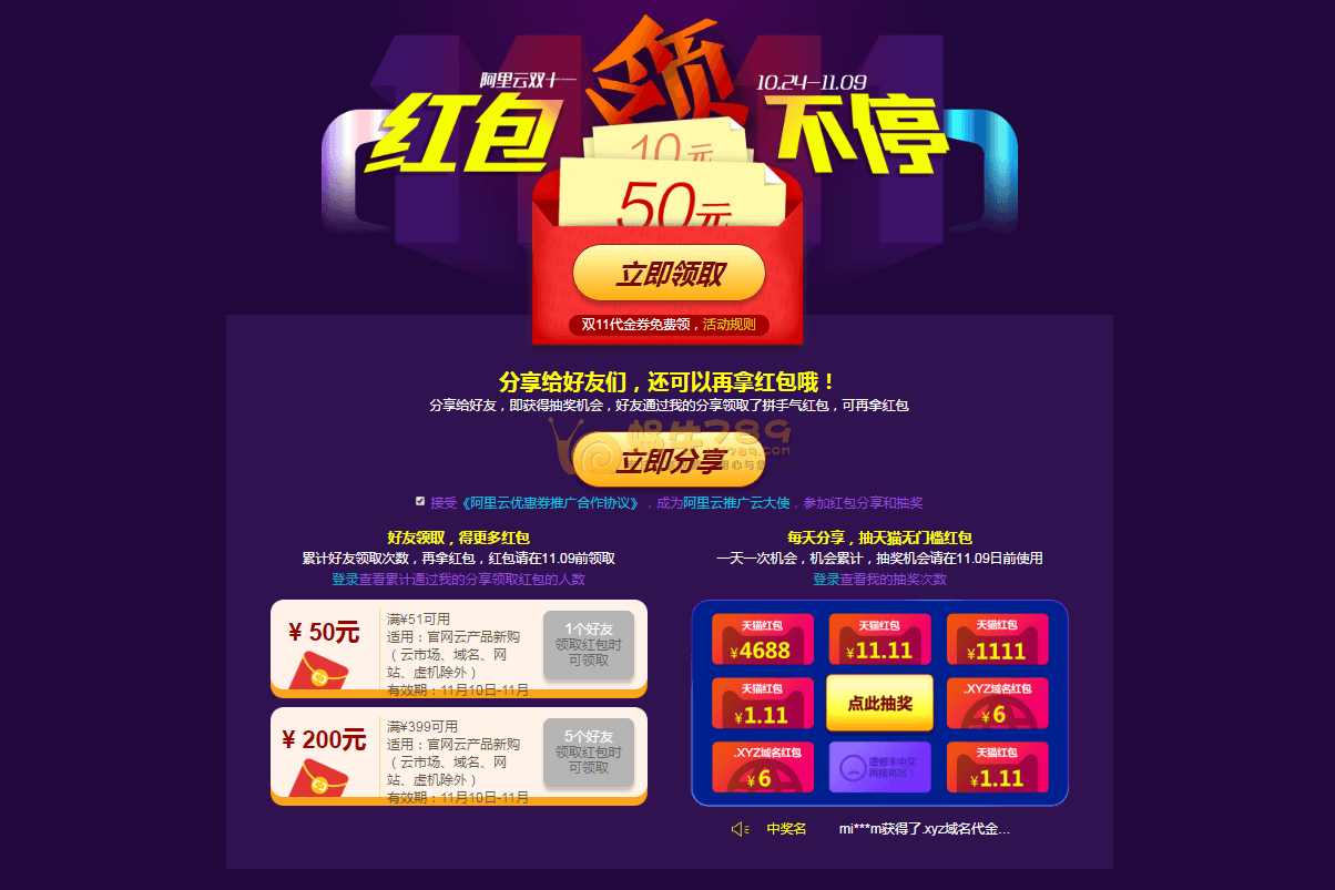 1、红包的有效期:2017年11月10日0点-2017年11月11日24点。 2、红包使用范围:- 云产品(通用)红包用于阿里云国内站点全部云产品的新购(云市场、域名、网站、虚拟主机除外)