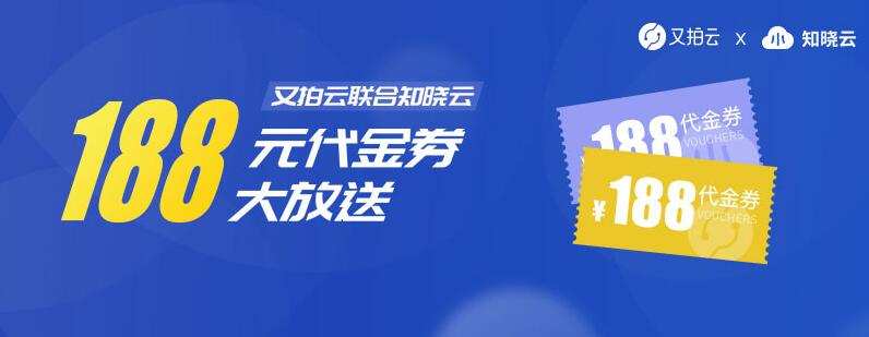 此次“又拍云”联合“知晓云”推出了188元代金券大放送活动,又拍云代金券:适用于CDN、存储、HTTPS 服务,有效期为 180 天;知晓云代金券:所有功能通用,有限期为 100 天。 1、又拍云老用户,注册知晓云可获188元知晓云代金券; 2、知晓云老用户,注册又拍云可获188元又拍云代金券; 3、活动期间同时注册又拍云及知晓云,可获得188元知晓云代金券+188元又拍云代金券。