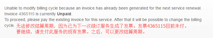 5、注意。也有可能你点击修改VPS付款周期时没有进入到更改页面,而是显示如下内容。表示已经生成了付款订单,你需完成支付此次订单后才能修改结算周期。