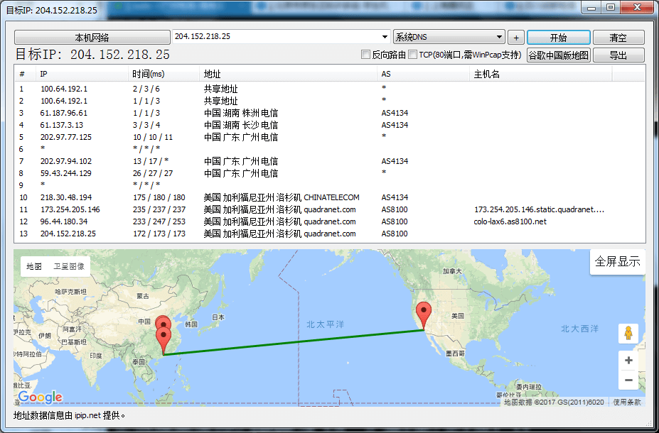 [root@host-10-10-10-13 ~]# mtr -rw 204.152.218.25 Start: Sat Dec 30 14:22:05 2017 HOST: host-10-10-10-13 Loss% Snt Last Avg Best Wrst StDev 1.|-- gateway 0.0% 10 0.4 0.5 0.3 0.6 0.0 2.|-- ??? 100.0 10 0.0 0.0 0.0 0.0 0.0 3.|-- 10.0.1.1 40.0% 10 4.1 5.1 3.9 9.2 1.9 4.|-- 171.91.159.97 20.0% 10 1.0 1.2 1.0 1.5 0.0 5.|-- 125.64.29.89 90.0% 10 6.2 6.2 6.2 6.2 0.0 6.|-- 182.140.220.253 0.0% 10 9.7 8.5 5.6 12.0 1.9 7.|-- 202.97.36.225 0.0% 10 43.6 42.2 40.2 43.6 0.9 8.|-- 202.97.94.146 90.0% 10 41.5 41.5 41.5 41.5 0.0 9.|-- 202.97.94.102 20.0% 10 40.9 40.0 36.8 42.4 1.6 10.|-- 59.43.244.133 0.0% 10 40.5 40.6 40.5 40.8 0.0 11.|-- ??? 100.0 10 0.0 0.0 0.0 0.0 0.0 12.|-- 218.30.48.194 0.0% 10 188.0 185.8 181.5 192.2 3.6 13.|-- 173.254.205.146.static.quadranet.com 0.0% 10 256.6 252.9 236.9 265.6 10.3 14.|-- colo-lax6.as8100.net 0.0% 10 264.8 263.4 248.4 301.6 14.9 15.|-- 204.152.218.25 0.0% 10 257.7 267.7 256.6 276.1 6.7辽宁沈阳联通