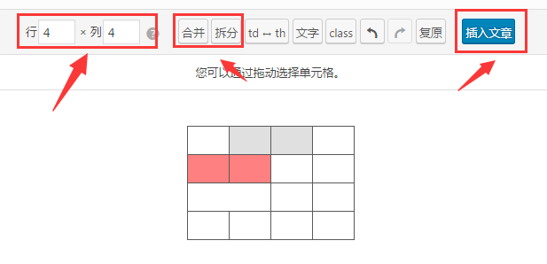 2、WP Tabel Tag Gen插件表格可视化操作界面如下图,可以自定义表格的行、列数,可以自由合并、拆分表格,使用非常简便。
