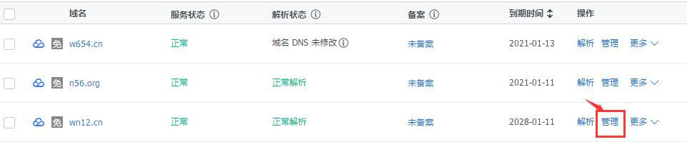 1、在“域名服务”“我的域名”栏目里找到自己要过户到其他账号的域名,点击“管理”。