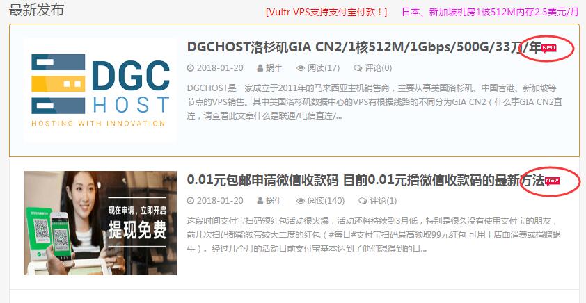 1、蜗牛介绍的此方法是为新文章在文章标题上添加“NEW”图标,24小时后自动取消,显示效果如下。