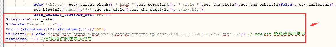 if($diff<24){echo "<img src='https://www.wn789.com/wp-content/uploads/2018/01/5-120601152048.png' />";} // new.gif 替换成你的图片