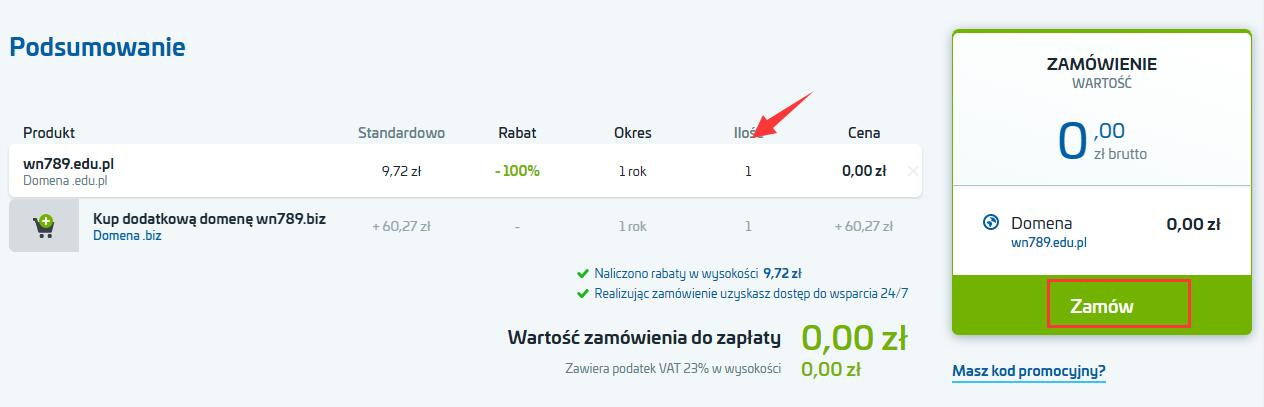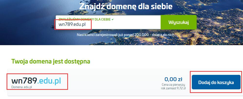 1、进入官网后在如下图位置输入你想注册的.edu.pl域名。当然也可以试试其他的,据说有多种后缀都是免费的,蜗牛没有做过多的研究,冲着免费edu域名去的。如果你填写的域名可以注册会显示如下图,我们点击右侧下图红框位置把域名加到购物车,然后再点击右上角购物车标志进入到购物车页面。