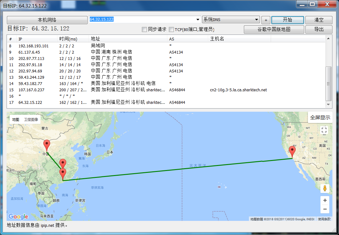 ------------------------------------------- 【四川 电信】 - 125.64.38.178 20 packets transmitted, 20 received, 0% packet loss, time 19211ms rtt min/avg/max/mdev = 189.722/189.893/190.230/0.563 ms ------------------------------------------- 【北京 电信】 - 106.120.243.142 20 packets transmitted, 20 received, 0% packet loss, time 19194ms rtt min/avg/max/mdev = 157.781/164.063/170.466/4.252 ms ------------------------------------------- 【北京 联通】 - 103.254.70.52 20 packets transmitted, 20 received, 0% packet loss, time 19229ms rtt min/avg/max/mdev = 168.006/205.108/254.349/31.797 ms ------------------------------------------- 【北京 移动】 - 218.205.152.14 20 packets transmitted, 20 received, 0% packet loss, time 19195ms rtt min/avg/max/mdev = 157.009/163.151/166.395/3.329 ms ------------------------------------------- 【上海 移动】 - 117.131.14.202 20 packets transmitted, 20 received, 0% packet loss, time 19161ms rtt min/avg/max/mdev = 132.153/140.233/147.834/4.741 ms ------------------------------------------- 【上海 电信】 - 211.144.205.58 20 packets transmitted, 11 received, 45% packet loss, time 20014ms rtt min/avg/max/mdev = 169.783/183.847/221.026/18.636 ms ------------------------------------------- 【上海 联通】 - 220.196.42.133 20 packets transmitted, 20 received, 0% packet loss, time 19204ms rtt min/avg/max/mdev = 176.798/183.444/198.157/4.903 ms ------------------------------------------- 【广东 电信】 - 121.11.69.135 20 packets transmitted, 0 received, 100% packet loss, time 29000ms ------------------------------------------- 【广东 联通】 - 27.40.0.30 20 packets transmitted, 20 received, 0% packet loss, time 19185ms rtt min/avg/max/mdev = 148.228/153.206/156.651/3.865 ms ------------------------------------------- 【广东 移动】 - 211.139.129.222 20 packets transmitted, 20 received, 0% packet loss, time 19175ms rtt min/avg/max/mdev = 168.120/168.517/168.993/0.567 ms ------------------------------------------- min:最低延迟 avg:平均延迟 max:最高延迟 mdev:平均偏差 -------------------------------------------4、路由追踪测试。 湖南电信