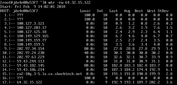 [root@VM_15_131_centos ~]# mtr -rw 64.32.15.122 HOST: VM_15_131_centos Loss% Snt Last Avg Best Wrst StDev 1. 100.104.221.129 0.0% 10 3.9 6.9 1.3 10.4 2.9 2. 100.104.247.232 0.0% 10 0.8 0.8 0.7 0.9 0.1 3. 10.196.28.197 20.0% 10 0.7 0.8 0.7 1.0 0.1 4. 10.196.0.58 0.0% 10 2.6 2.5 2.3 2.6 0.1 5. 180.163.27.205 90.0% 10 2.9 2.9 2.9 2.9 0.0 6. 101.95.225.89 70.0% 10 4.5 3.2 2.5 4.5 1.1 7. 124.74.166.137 0.0% 10 2.9 6.1 2.9 9.7 2.3 8. 61.152.86.54 0.0% 10 7.7 6.6 5.3 8.0 1.1 9. 202.97.57.25 0.0% 10 7.2 6.6 5.1 7.7 0.9 10. 202.97.91.26 0.0% 10 6.0 6.8 4.9 8.7 1.4 11. 59.43.244.113 0.0% 10 3.3 3.4 3.3 3.6 0.1 12. 59.43.182.145 80.0% 10 143.8 141.4 139.1 143.8 3.4 13. 59.43.248.105 0.0% 10 165.3 165.0 158.8 169.5 4.1 14. cn2-10g.3-5.la.ca.sharktech.net 0.0% 10 167.1 166.9 166.8 167.1 0.1 15. ??? 100.0 10 0.0 0.0 0.0 0.0 0.0 16. 64.32.15.122 10.0% 10 170.5 162.8 158.6 170.5 5.3深圳阿里云