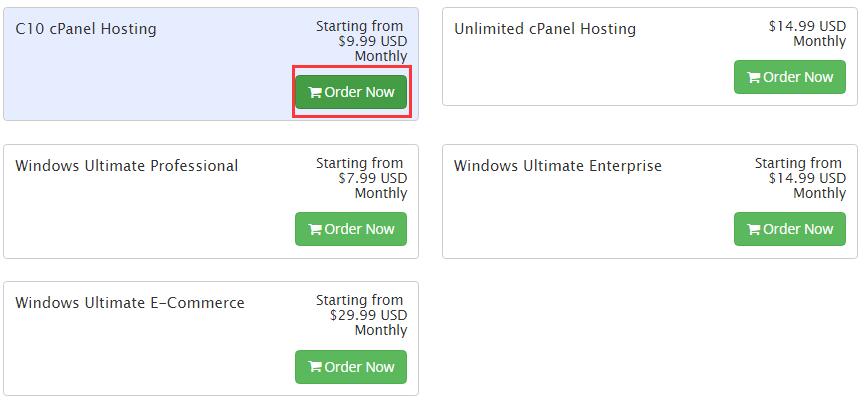 3、这里我们选择虚拟主机“Ultimate Hosting”,进入到主机套餐选择页面。根据自己需要选择好套餐,教程选择的是“C10 cPanel Hosting”,点击“Order Now”。