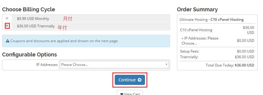 5、选择付款周期,一般建议至少年付,那样会划算点。下图截图年付是错误了,那个选项是三年付,刚好是活动价格,每月才1美元。比价划算。