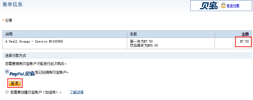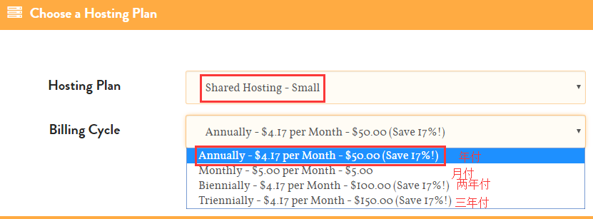 3、这里我们选择“Small”,点击“BUY NOW!”进入到购买选项和个人注册信息填写。注册信息如下图,首先是付款周期选择。