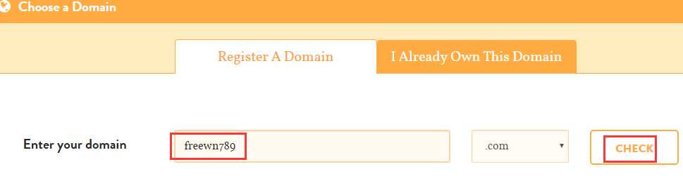 因为赠送.com域名一年,我们选择“Register Domain”注册一个域名,如果不赠送域名你想绑定自己的域名就点“I Already Own This Domain”。