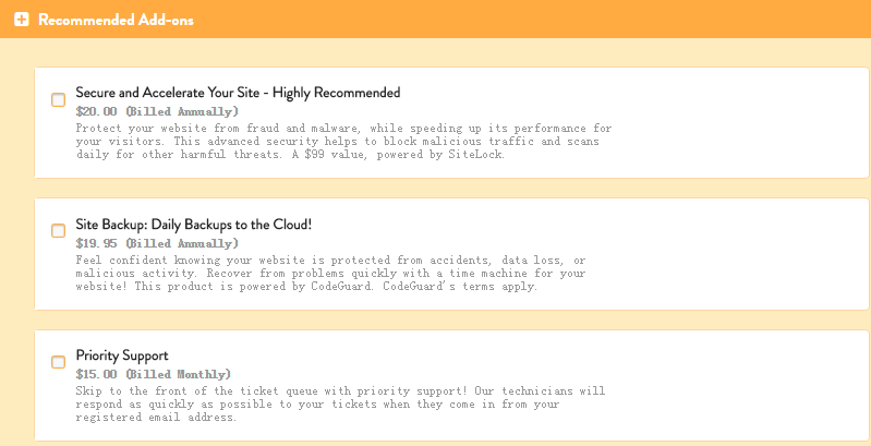 2.点击“SHARED”进入共享主机选择页面。共享主机有四个套餐可以选择。下面截图一次是Small、Tiny、Medium、Large四个套餐。相关配置如下图。