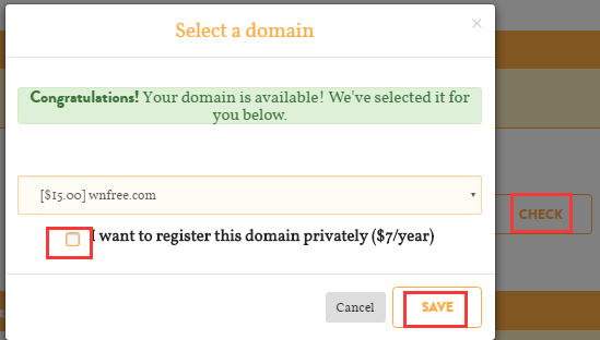 填写好你需要注册的域名后点击“CHECK”。如下图显示表示可以使用。还有就是域名下面的红框不能勾选,否则需要付费7美元。