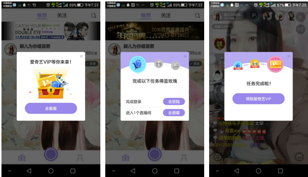 奇秀直播是爱奇艺旗下的直播平台,爱奇艺在2016年7月发布此直播品牌。奇秀官方近期正在进行安装手机APP送爱奇艺VIP黄金套餐会员活动。 1.参与人员:全体爱奇艺新老账号 2.参与方式:手机下载奇秀直播APP并完成任务 3.活动奖励:赠送爱奇艺VIP黄金套餐3天(即时到账) 4.活动时间:未知(请尽快参与)奇秀直播免费送3天爱奇艺VIP会员活动介绍: