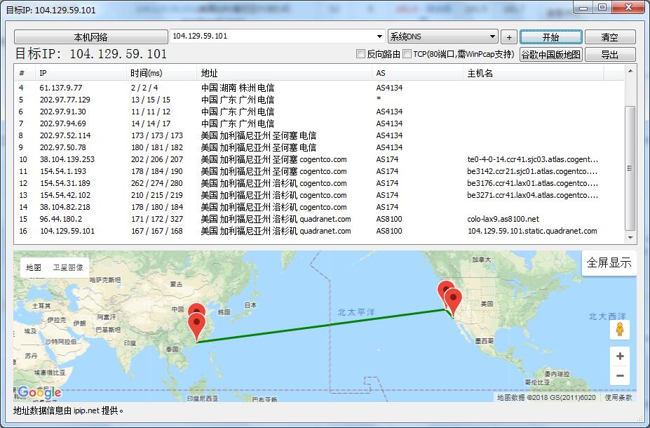 洛杉矶QuadraNet机房亚洲优化线路测试IP:104.129.59.XXX/104.129.59.101/104.129.59.241
