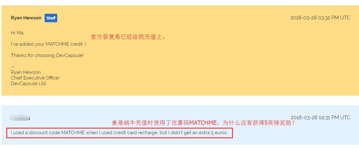 2、蜗牛使用优惠码:MATCHME充值后并没有马上获得赠送的额度,于是提交了一个工单,询问为什么没有赠送,大概一个销售后得到了回复,赠送金额也到位了。