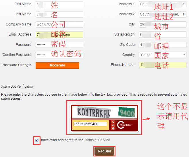 2.填写注册信息。在这个页面,如果没有显示验证码图片请继续往下看采用其他方式注册。填写完注册信息后点击“Register”完成注册。