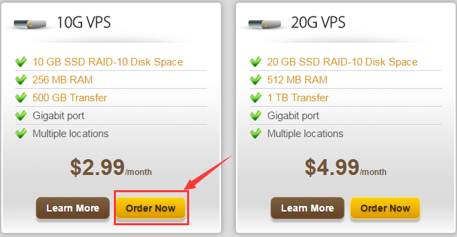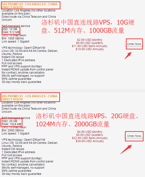 2.在VPS套餐选择页面选择自己需要的套餐,蜗牛列举了洛杉矶中国直连机房和凤凰城的VPS。