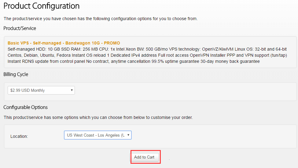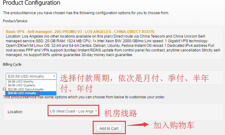 3.选择购买周期和机房线路。然后点击“Add to Cart”加入购物车。