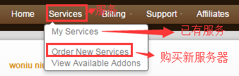 1.登录账号后点击“Services”中的“Order New Services”进入到VPS套餐选择页面。如果你想查看管理自己已有的服务强点击“My Services”。