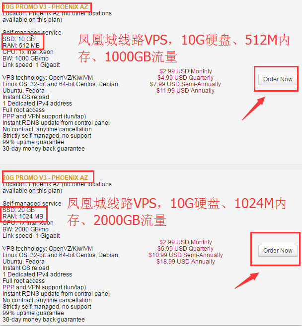 套餐名称:10G PROMO V3 - PHOENIX AZ 机房地点:凤凰城 硬盘大小:10GB固态硬盘 内存大小:512MB CPU核数:1个英特尔至强 流量限制: 1000GB/月 宽带端口:1千兆 操作系统:Linux VPS技术:OpenVZ/ KiwiVM 服务器IP:1独立IP 美元价格:月付$2.99/季度付$4.99/半年$7.99/年付$11.99(30天无条件退款保证) RMB价格:月付20元/季度付34元/半年55元/年付82元 (点击购买一 点击购买二)套餐名称:20G PROMO V3 - PHOENIX AZ 机房地点:凤凰城 硬盘大小:20GB固态硬盘 内存大小:1024MB CPU核数:1个英特尔至强 流量限制: 2000GB/月 宽带端口:1千兆 操作系统:Linux VPS技术:OpenVZ/ KiwiVM 服务器IP:1独立IP 美元价格:月付$2.99/季度付$6.99/半年$10.99/年付$18.99(30天无条件退款保证) RMB价格:月付20元/季度付48元/半年76元/年付131元 (点击购买一 点击购买二)