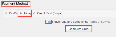 5.在Payment Method(付款方式)选择“Alipay”支付宝付款。然后点击“Complete Order”进入到付款页面。
