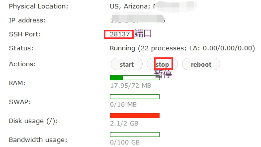 3.关于系统重装,在重装之前一定要点“STOP”暂停机器。另外请注意每次系统重装后端口会发生变化,不再是默认的22。
