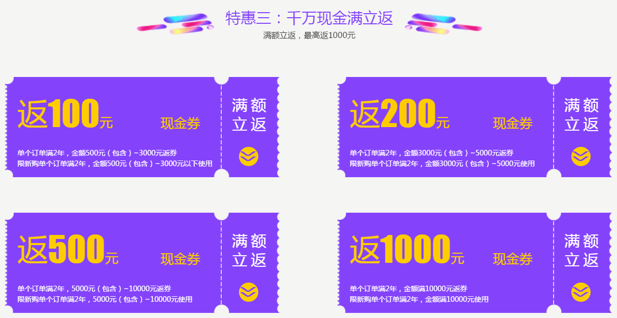 - 返500元现金券:单个订单满2年,5000元(包含)~10000元返券,限新购单个订单满2年,5000元(包含)~10000元使用。