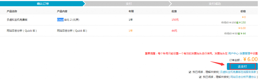 4、点击去支付。完成付款,仅需6元可以拥有1年虚拟主机。