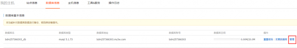 5、点击导航栏“数据库信息”可以进入到数据库管理。我们点击管理可以进入数据管理页面。