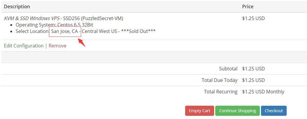 3、点击“Add to Cart”进入购物车后。如果出现如下图显示“San Jose,CA”圣何塞机房就对了,显示Sold Out我们直接无视。