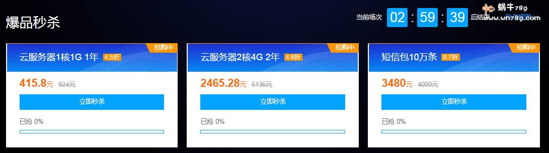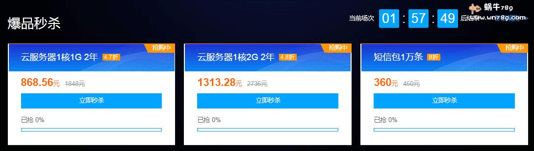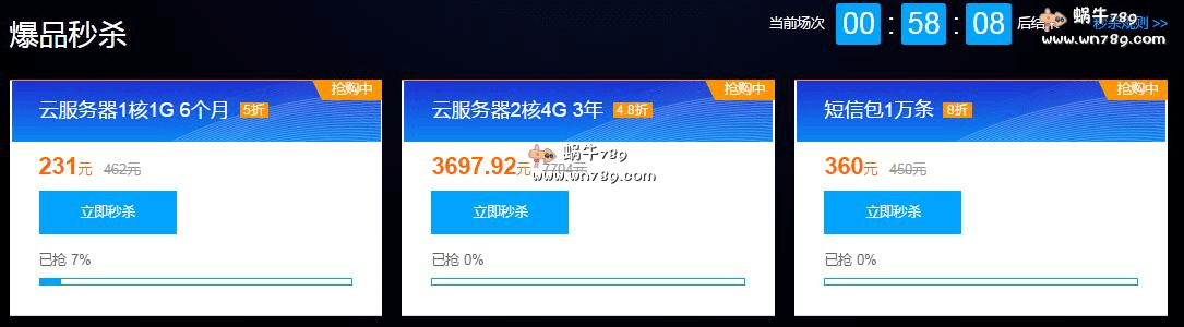 下面是每天16:00爆品秒杀产品,两款云服务器和短信包10条。如果1核1G内存能满足你的需求,那么请看准每天的16:00去抢购。同样有香港等海外机房可以选择。