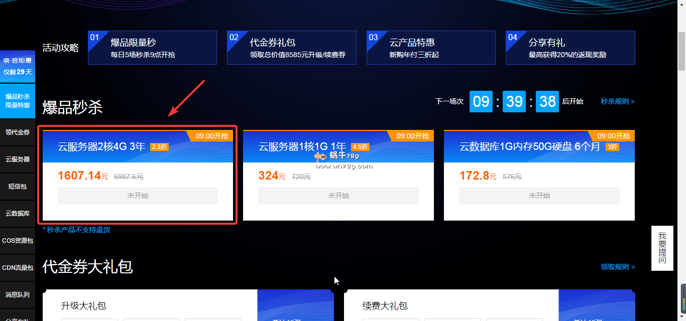 腾讯云年中大促 香港云服务器三折起 云产品升级/续费代金券免费领文章当中对活动做了简单的介绍。今天晚上无意当中发现明天(26日)上午9:00的秒杀活动当中有一款非常给力的产品:2核心CPU、4GB内存、1Mbps带宽独享不限流量,秒杀价格1607.14元/3年,如果是建站使用,我们还有香港等稳定的海外节点可以选择。
