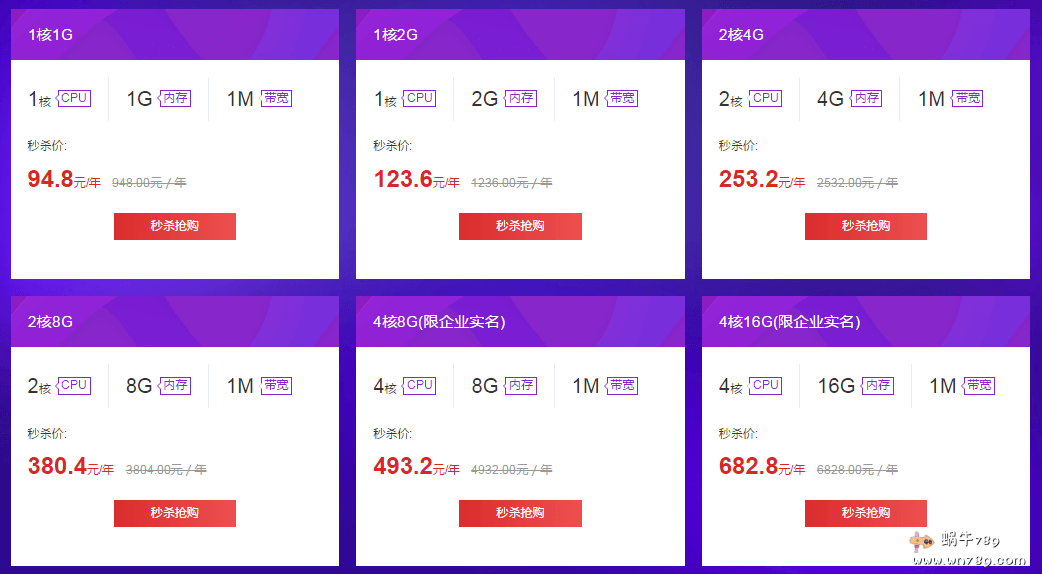 云服务器秒杀活动是本次活动亮点,价格非常便宜,1核1G内存1Mbps带宽的云服务器只需94.8元/年,最高配置为4核16G内存1Mbps带宽也只需682.8元/年(企业认证用户),个人用户最高配置为2核8内存1Mbps带宽同样也只需380.4元/年 。活动时间2018.5.30-2018.6.30,每日10:00开抢,1核1G、1核2G、2核4G、2核8G各限量100台/日,4核8G、4核16G各限量20台/日。