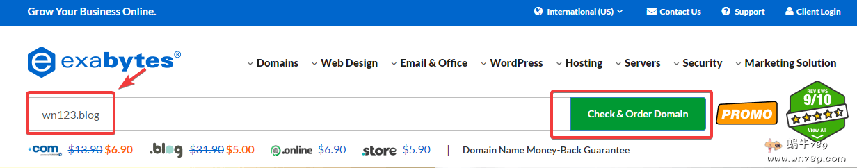 1、点击上面地址进入Exabytes,然后在如下图位置输入你要注册的.blog域名。