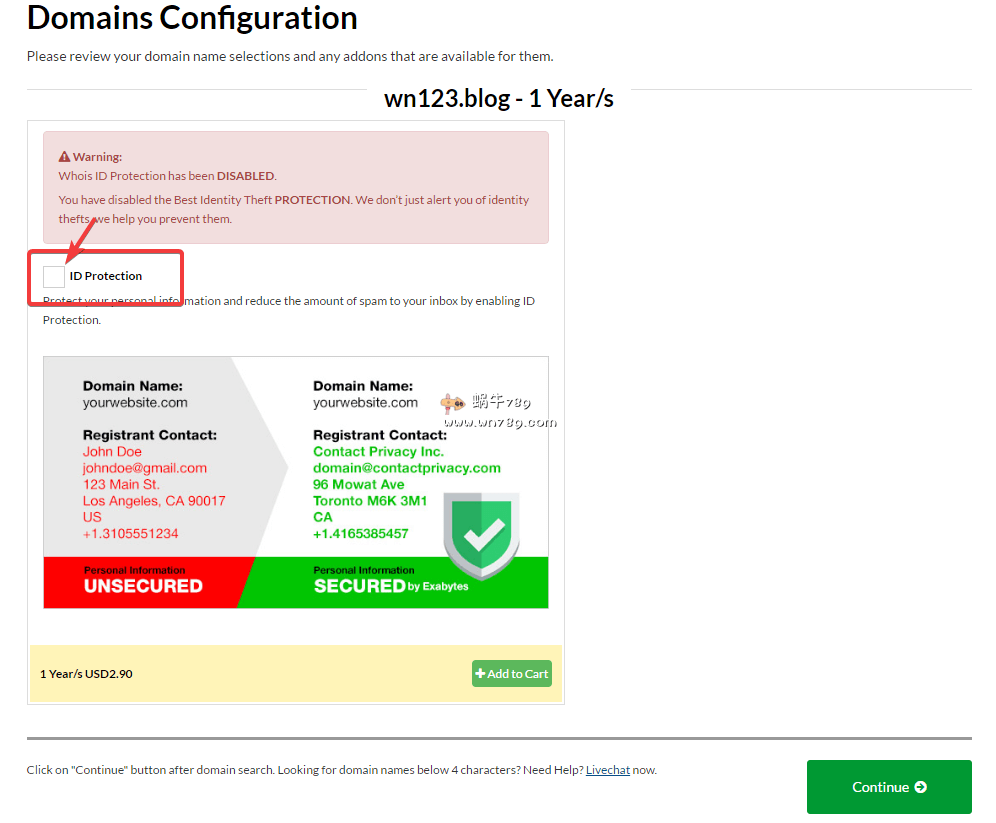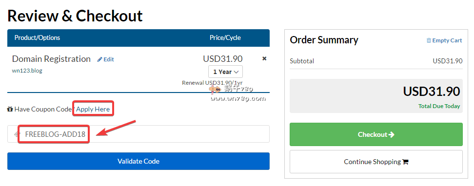 3、进入到下图页面后,输入优惠码“FREEBLOG-ADD18”价格就变成0了,然后选择PayPal付款即可。免费.blog域名就撸到手了。每个账号优惠码只可以使用一次。