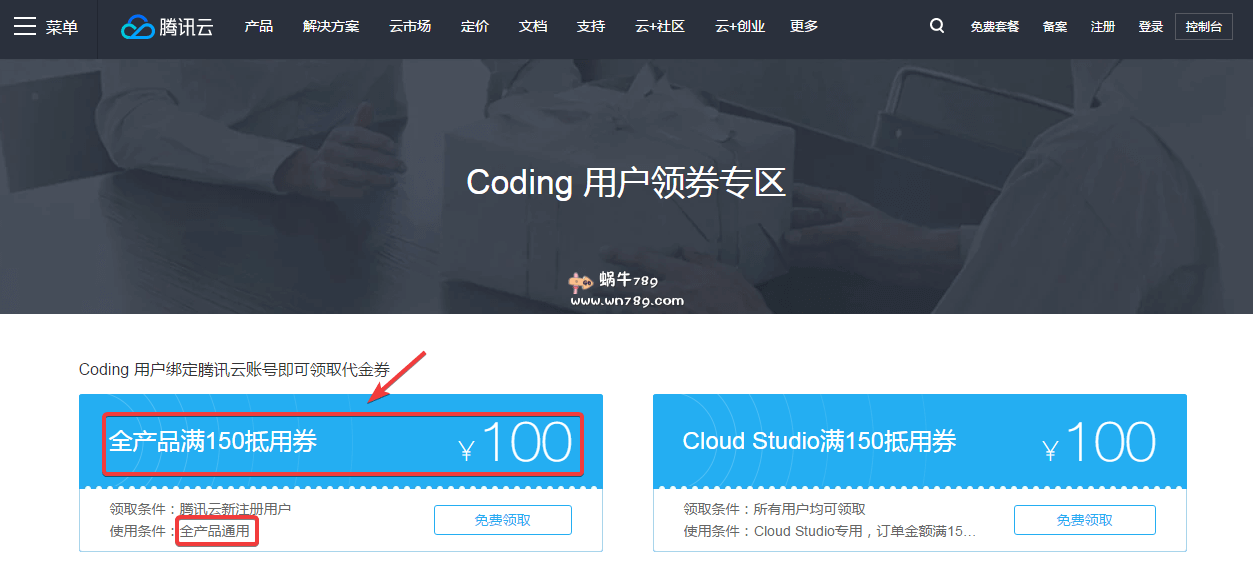 Coding.net绑定腾讯云账号免费领取100元无门槛预付费代金券。蜗牛有点没有搞清楚,目前自己没有新的腾讯云账号,也无法验证此次活动到底是送什么面值的代金券。但对于此活动蜗牛记得很清楚,最开始送的是100元无门槛代金券、后来活动改成了满150减100代金券(新用户)满200减100代金券(老用户)。话说回来由于是全产品可以使用,不管是满150减100、200减100都已经非常不错了。