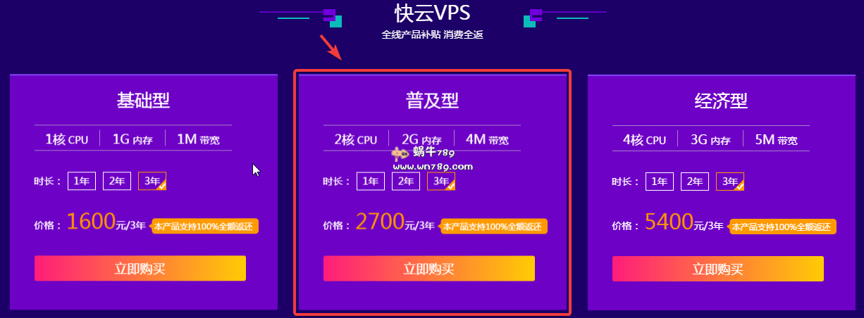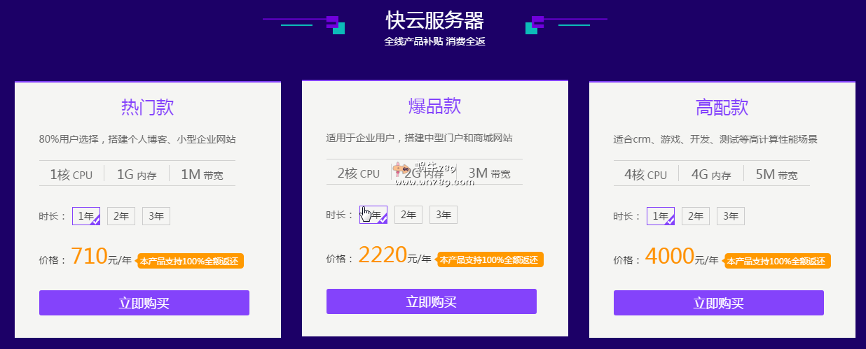 2、快云VPS。个人认为建站使用选择快云VPS更为划算,因为价格相对要便宜点。至于活动中的三款配置,个人更倾向于选择2核2G内存4Mbps带宽都得方案,如果用返的快云币续费此套餐的话,可以再续费三年,相当于2700元购买6年。