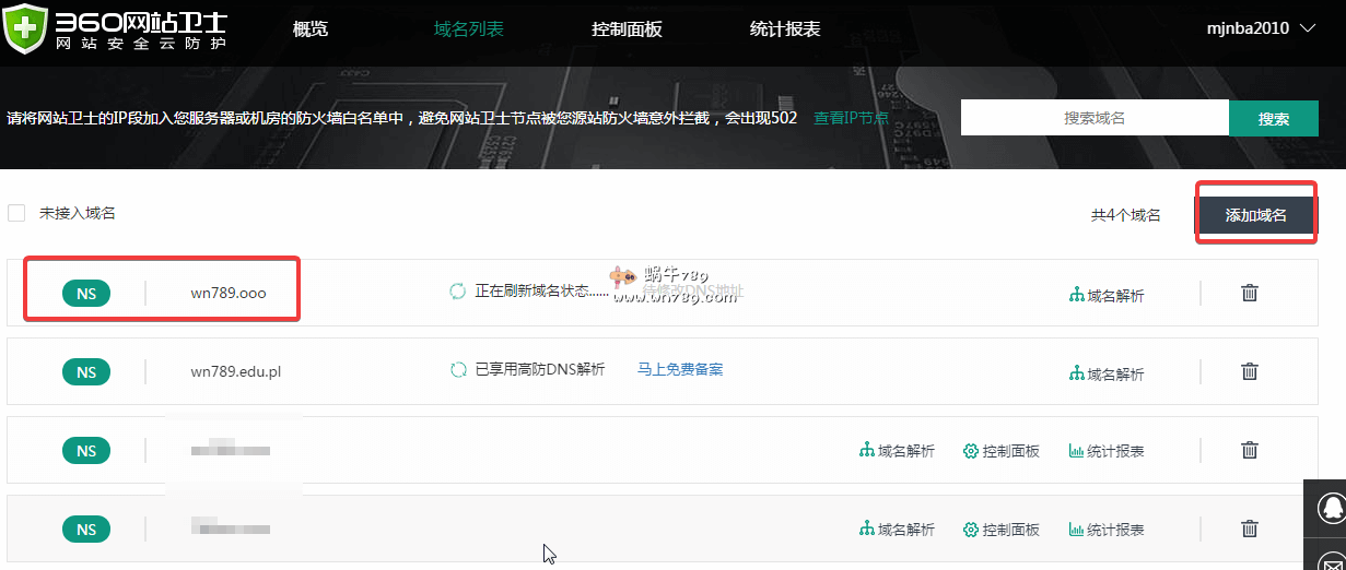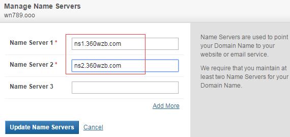 下图是蜗牛把自己注册的域名改成了360网站卫士的NS服务器地址,以后就使用360网站卫士的NS服务器进行解析。