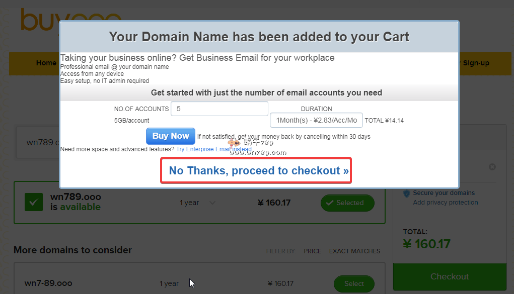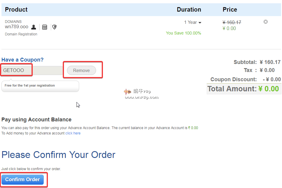 2、应用优惠码。如果Have a Coupon?下面没有优惠码,请自己输入“GETOOO”,然后点击后面的按钮应用优惠码,应用优惠码后会显示如下图“Remove”删除。这样轻而易举就申请到.ooo免费顶级域名了。