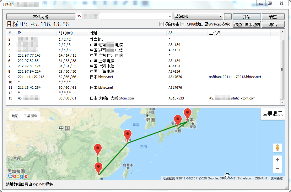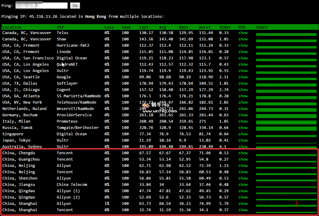 8、国内电信、联通、移动、铁通四大网络ping测试结果。四大网络平均ping值是65.7毫秒,速度已经相当不错了,联通、电信访问ping在60毫秒左右。