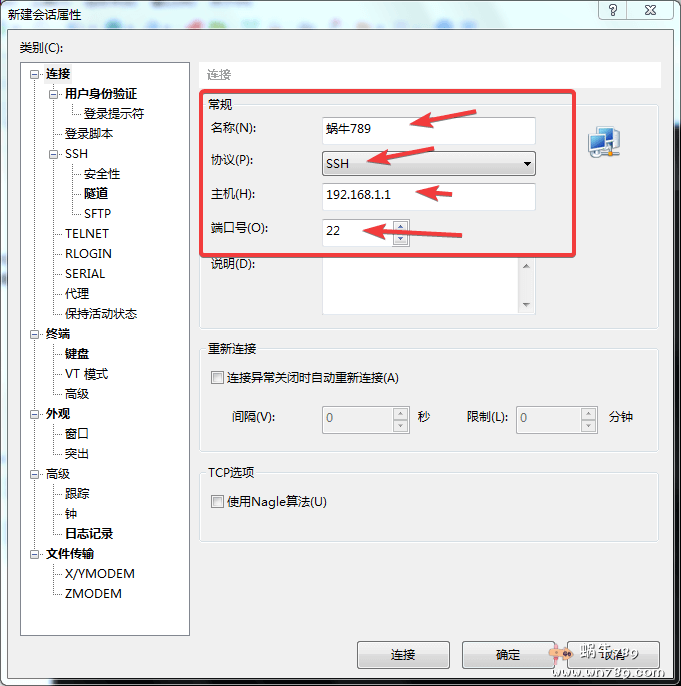 2、填写主机相关信息。名称可以自定义填写,让自己知道这个对应哪一个服务器就行,协议默认是SSH,主机后面填写你服务器的IP,端口一般默认是22,但也有例外的,如高品质美国CN2就不是默认22。填完之后点击确定或连接都行。