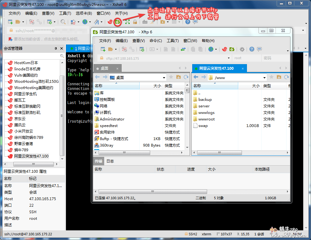 6、Xshell 6支持直接在工具栏启动Xftp工具,进行文件上传、下载管理。