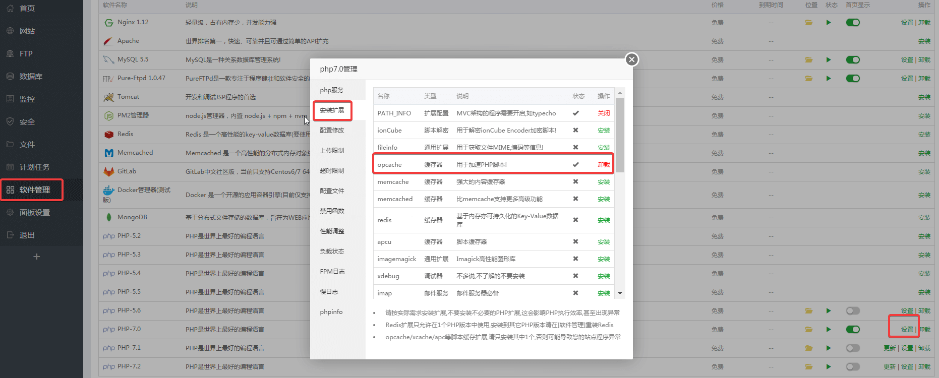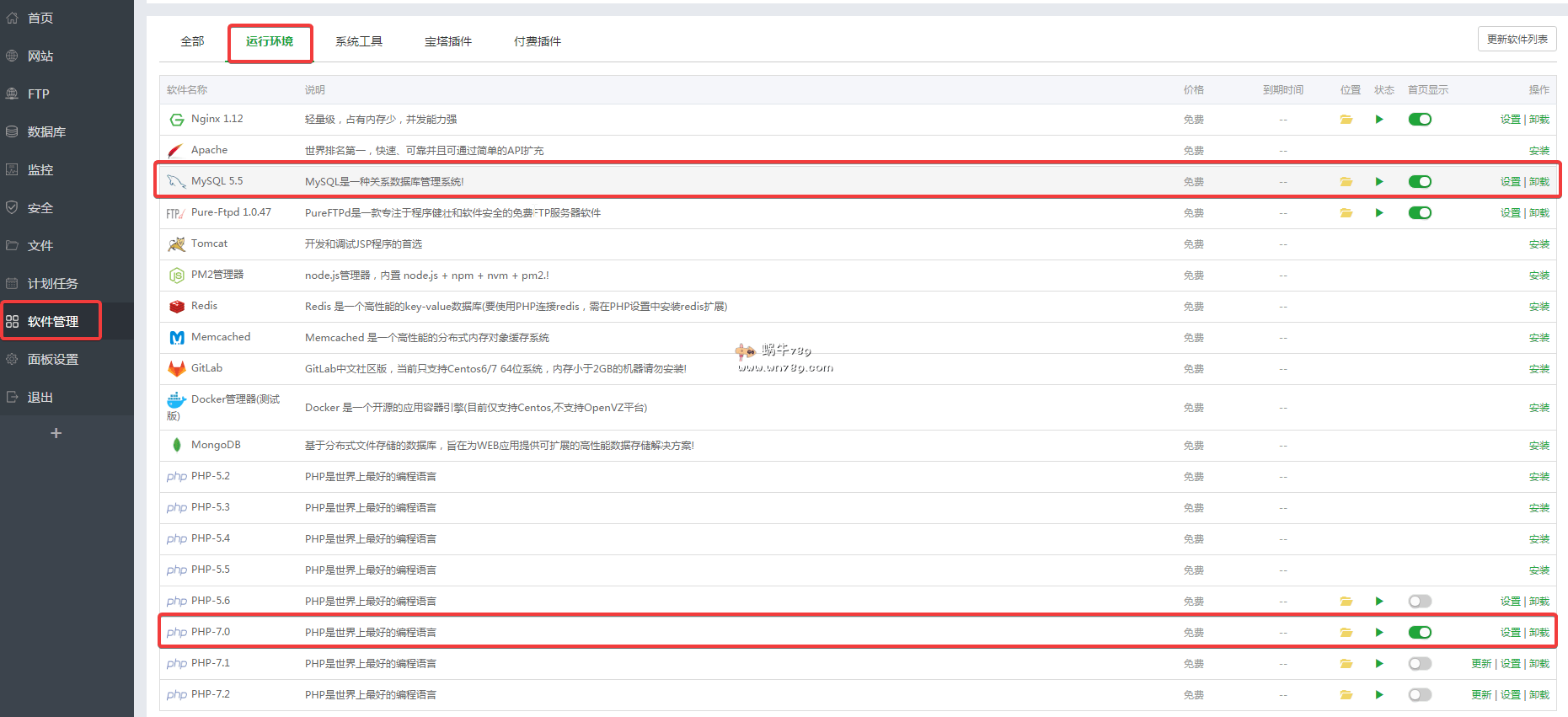 1、蜗牛通过宝塔面板安装的建站环境是LNMP,使用的Nginx 1.12、MySQL 5.5、PHP-5.4,解决过程当中,蜗牛先把MySQL 5.5升级到了5.5的最新版本,紧接着新安装了PHP7.0版本,并升级到最新版本。
