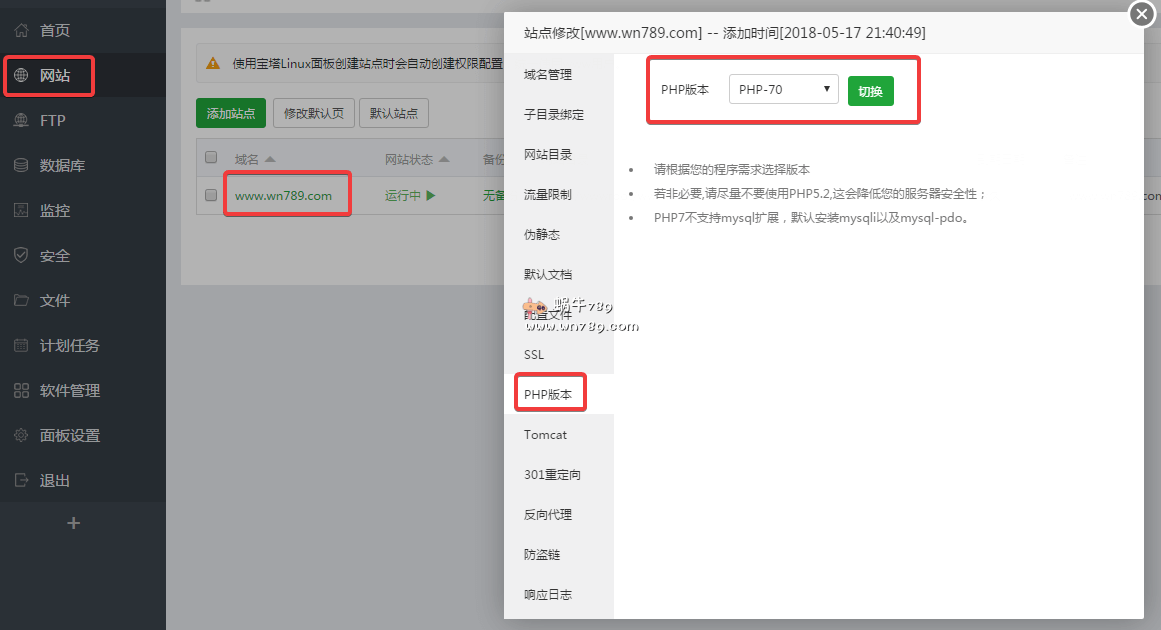 2、通过网站管理,更换PHP5.4版本为PHP7.0。
