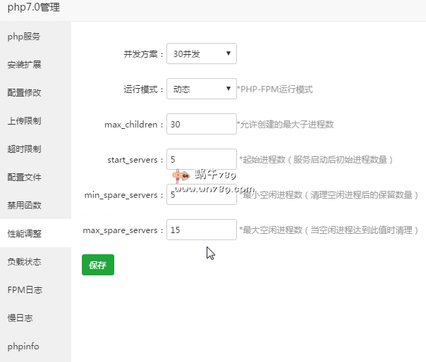 性能调整。这里大家可以根据自己服务器配置进行设置,宝塔面板比较人性化,会根据你的服务器配置设置推荐方案。其实设置并发多少,大家可以根据自己服务器内存大小进行计算,一般一个php-fpm进程占用内存30M左右,以2048MB内存(2G内存)来计算,大概可以设置68个并发。蜗牛使用的就是4核2G内存配置的服务器,安装宝塔面板后推荐的事50并发,但蜗牛觉得自己更笨用不到那么高的并发,所以设置了30并发的方案,并把max_spare_servers数字调整成了15.