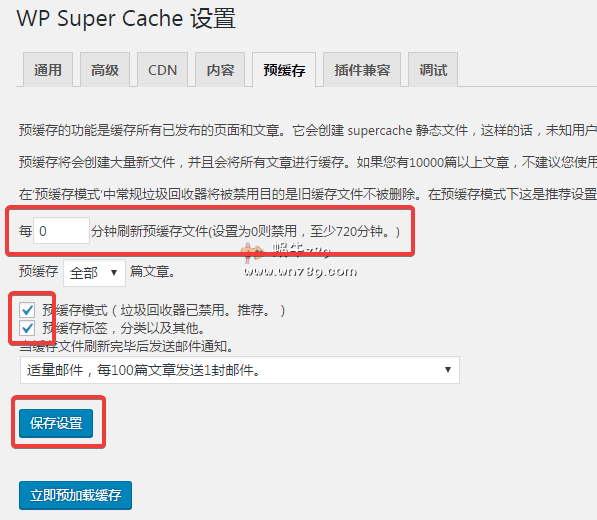 3、预缓存设置。首先一定要设置每0分钟刷新预缓存文件,然后要勾选“预缓存模式”、“预缓存标签,分类以及其他”,点保存设置完成即可。至于要不要“立即预加载缓存”生产全站静态页面,这个大家根据自己的使用的服务器来,如果存储够大,博客文章也不是很多可以选择,如果使用的是虚拟主机一般不建议使用此功能。