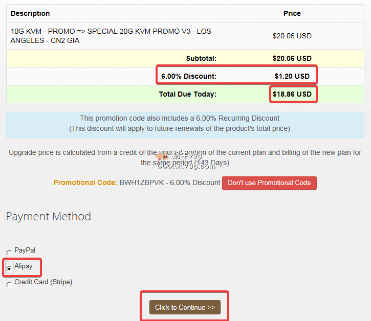4、下面是升级付款页面,如果你购买VPS使用了终身优惠的优惠码,升级时会自动添加,升级会按你现有套餐到期的天数计算升级的费用。蜗牛教程中升级的方案还是143天到期,那么升级的费用等于,升级套餐的143天的费用减去原有套餐143天的费用就是升级需要支付的费用。不了解清楚也没关系,高品质美国CN2没有乱收你一分钱,都是实打实计算的。
